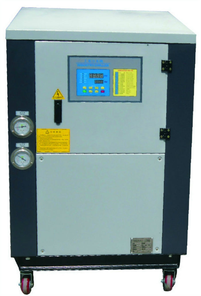 工業(yè)冷水機(jī)為一體箱式外形,機(jī)組內(nèi)部配備壓縮機(jī)、蒸發(fā)器、冷凝器、循環(huán)泵、膨脹閥、不銹鋼保溫冷水箱及溫度控制裝置等零部件,用于保持冷水溫度和防止發(fā)生溫度值,工業(yè)冷水機(jī)在恒定的溫度和壓力下不斷循環(huán),保證降溫的穩(wěn)定性.